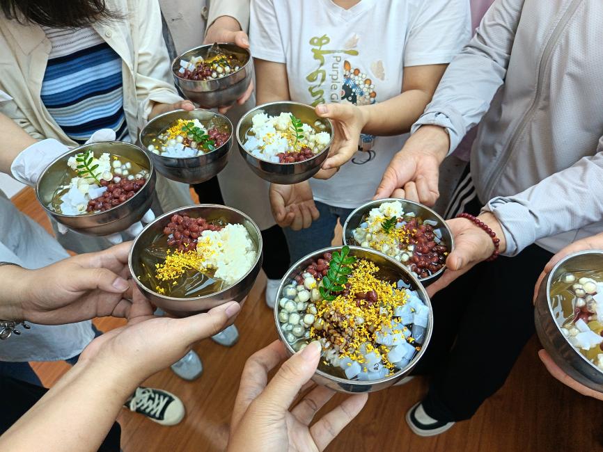 陆老师现场完整演示了老凉粉的“点睛之笔”:如何搭配丰富的小料。看着陆老师熟练地加入各种配料,香气仿佛已飘散开来。参与人员兴致勃勃地围在操作台旁,将新鲜制作的凉粉小心翼翼地盛入碗中,依据个人喜好,自由搭配红豆、爆珠、桂花、糖水等各式各样的小料。一碗碗点缀着缤纷色彩的徽州老凉粉很快摆满了桌面。大家互相展示、交流着各自的“作品”,现场充满了欢声笑语。