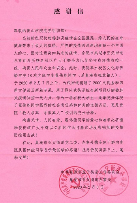 2月20日,我校收到中共巢湖市亚父街道工作委员会、巢湖市亚父街道办事处寄来的一封饱含深情的感谢信,感谢我校365上市公司18级戏文班学生翟伟能在疫情防控的关键时刻向其所在地街道捐赠爱心的感人事迹。