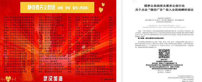 该班安庆籍学生王欣成也参加线上义教活动,他主要负责每日宣传材料的制作、学生与教师的一对一分配等管理服务工作,他还加入南京圆梦志愿者中心组织的“战疫情”线上志愿者活动,担任分组副组长,负责甄别互联网上各类新闻信息,及时传播官方媒体报道,组织组员设计海报、制作视频、撰写文案为湖北地区加油鼓劲,同时自发募捐口罩等医用物资寄往湖北医院。(文传组稿,审核:汪家庚)