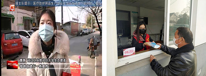 16广编班学生党员唐荣报名成为家乡泰州市三野社区防控志愿者,从2月2日起向社区居民宣传疫情防控注意事项,宣传如何科学应对疫情。在路口,给行人测体温、做登记,劝导外地人员绕行。