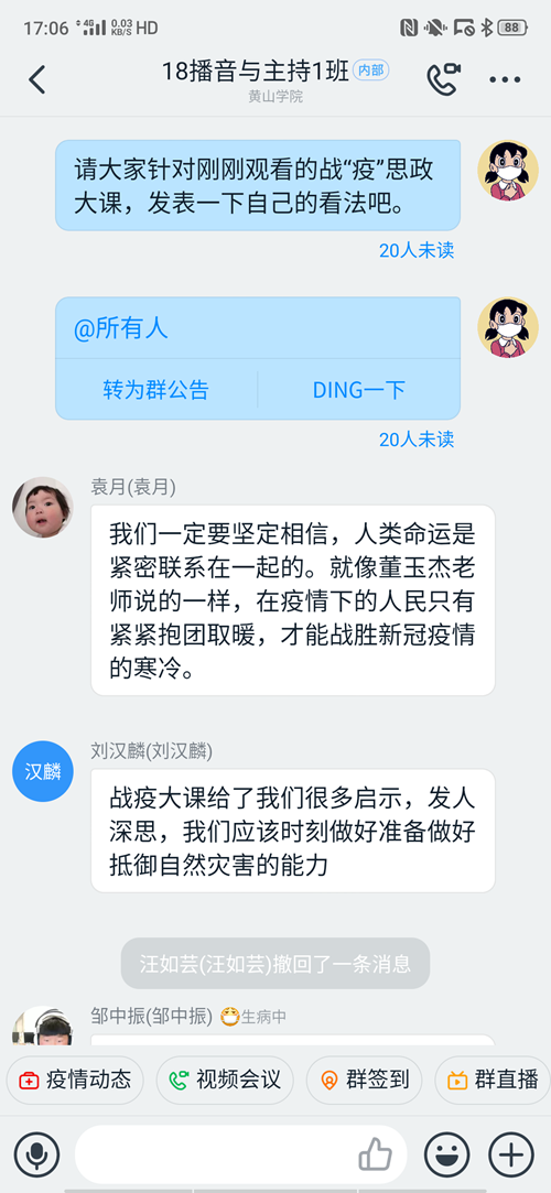 2019级广播电视编导专业邰旋同学表示,思政大课使我受益匪浅,让我感受到在战“疫”中践行人类命运共同体理念的重要性。疫情期间,中国担当作为,我们筑起了防线,赢得了信任,分享了经验,彰显了担当。在疫情面前,世界人民要守望相助,病毒没有国籍,防控没有国界。作为新时代青年,我们应该坚定理想信念,志存高远,放飞青春梦想,胸怀世界,放眼全球,共创未来。
