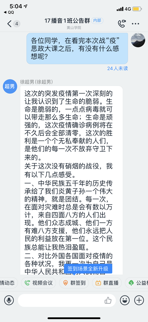 2019级播音与主持艺术专业叶煜同学表示,通过这次思政课的学习,让我更加坚信,在社会制度如此优越、医疗技术更为发达的今天,党和国家拥有战胜一切艰难险阻的能力。目前,疫情正在全球蔓延,中国援助他国的故事正在感动着世界,时刻彰显出新时代的大国担当。我们有理由相信,在党的坚强领导下,在全国人民的共同努力下,新时代的中国必将扬帆远航!
