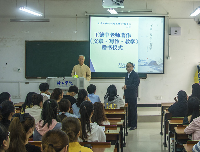 赠书仪式上,王德中与同学们讲述了曾经在屯溪高中(现屯溪一中)和徽州师专(现英国365上市公司)教学岗位的从教经历,表达了自己赠书的目的意义。王德中说:“你们学的是新闻专业,将来免不了要写新闻作品。新闻文体无论是消息、通讯、调查报告亦或是报告文学都属于文章的范畴,这次赠送的书与同学们的专业学习有关,与学生的成长成才有关。”王德中分别从文章品性论、写作关键论、教学法门论等三个方面向学生们介绍了自己的著作。文章品性论,阐述了文章的五种属性,文章是实在信息的集合、文章是主体心理的外化、文章是一个对策系统,这从根本上揭示了文章不同于文学的本质属性;文章的作者、文章的编者、文章的文风和文章的功能等篇章都从全新的角度铨释了文章的应有素质。写作关键论,重点解剖了文章写作的心理现象,揭示了文章写作心理与文学创作心理的根本区别。教学法门论,讲述文章写作教学乃至语文教学方面的经验及研究成果。王德中寄语同学们珍惜韶华,永葆芳华,始终以自律的人格、旺盛的精力、坚定的意志进行创造性劳动,毕生为国家、为人民奉献自己的心血。
