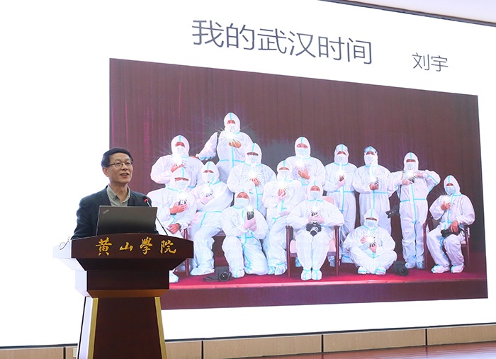 刘宇以“我的武汉时间”为题,讲述摄影作品背后的动人故事。他表示,“我们是以摄影的名义,替国家表达对医护人员的敬意。也许那一张肖像可能定格的不是他们最好看的样子。对于他们可能就是一生中最值得珍藏的记忆。好照片就是翻开老照片时带来的感动。”刘宇还勤于文字记录,出版了《我怕将来会忘记—武汉抗疫手记》一书。讲座在刘宇与援鄂医疗队队员张曦共同演唱的《只要平凡》视频短片播放中落幕。