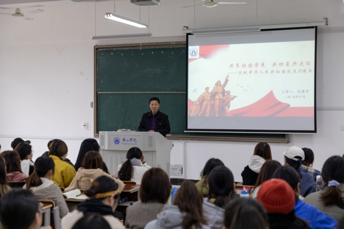 11月25日下午,校党委委员、副校长张德学在文端楼2206教室为英国365第54期入党积极分子讲授《共享祖国荣光 共担复兴大任》专题党课。