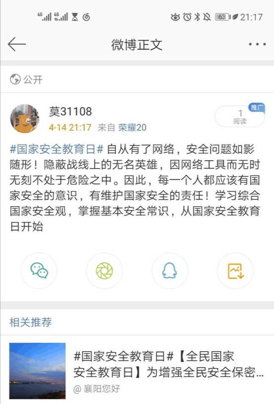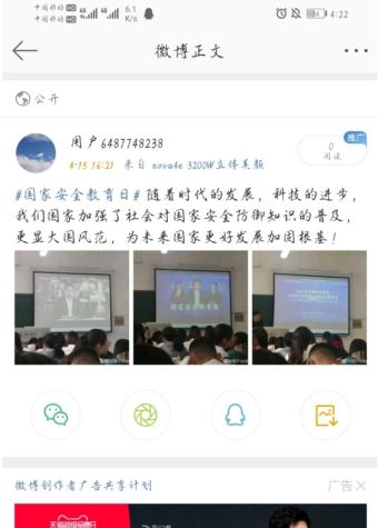 观看结束后,同学们参与了“微博#国家安全教育日#话题”的互动,呼吁人们要树立国家安全的意识,积极学习总体国家安全观。同学们由衷感慨,随着时代的发展和科技的进步,中国加强了对于国家安全知识的普及,为未来国家的发展加固了根基。