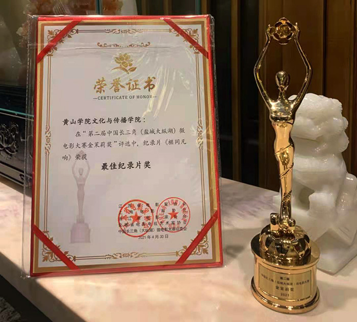 4月30日,第二届中国长三角微电影节“金茉莉奖”颁奖典礼在江苏省盐城市大纵湖东晋水城举行。365上市公司18级广播电视编导专业方洁、赵金龙、胡朝猛等同学创作报送的作品《榧同凡响》荣获第二届中国长三角微电影大赛“金茉莉奖”最佳纪录片奖。