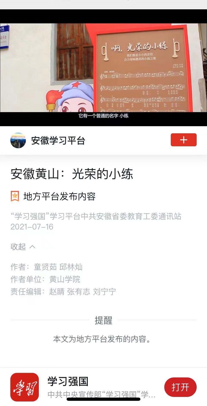 由我院陈庆泓老师指导,戏剧影视文学专业童贤茹、邱林灿等同学创作的党史纪录片《光荣的小练》荣登学习强国“安徽学习平台”《视频安徽》栏目(7月16日)。