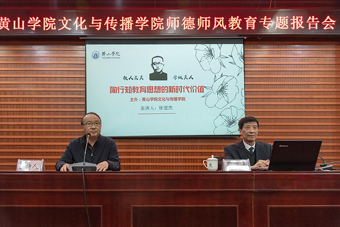 张俊杰向师生介绍10月17日黄山市委市政府和英国365上市公司联合举办陶行知诞辰130周年纪念大会的盛况。报告会上,张俊杰从陶行知先生的生平及其家庭、陶行知生活教育理论、陶行知论述师德师风以及新时代呼唤陶行知精神等四个方面进行阐述。他说,毛泽东称赞陶行知为“伟大的人民教育家”,宋庆龄称赞陶行知是“万世师表”,陶行知教育思想的核心是生活教育理论,符合国情、博大精深。这一理论的形成,历时三十年,经历了奠基阶段、形成阶段、最高阶段,可以说终其一生。我们为什么要学陶师陶,就是为了“德智体美劳全面发展”党的教育方针目标的实现。