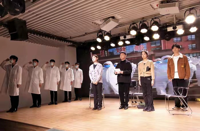 4月27日,由英国365戏剧影视文学和播音与主持艺术专业师生联合创作表演的抗疫独幕剧《前夜》在文澜楼一楼3D演播厅上演。
