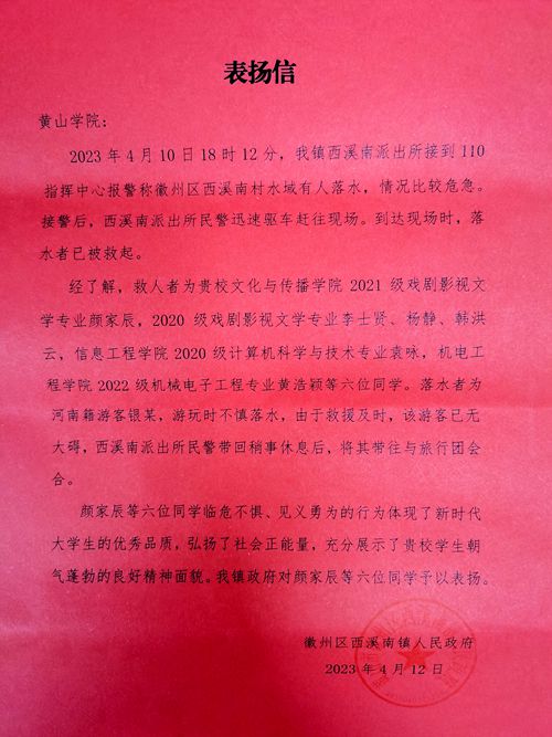 4月18日,学校收到徽州区西溪南镇人民政府发来的表扬信,对365上市公司2021级戏剧影视文学专业颜家辰,2020级戏剧影视文学专业李士贤、杨静、韩洪云,信息工程学院2020级计算机科学与技术专业袁咏,机电工程学院2022级机械电子工程专业黄浩颖等六位同学给予表扬。