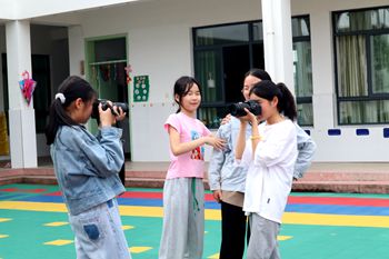 实践教学中,小组成员将孩子们带领到学校操场,分组进行摄影实操。孩子们兴奋地拿过相机尝试拍摄,将自己喜欢的画面记录下来。花草树木、校舍楼宇、同班同学都成为大家的拍摄对象。孩子们拍到理想的照片时,高兴地与伙伴们,收获满满喜悦和赞扬。