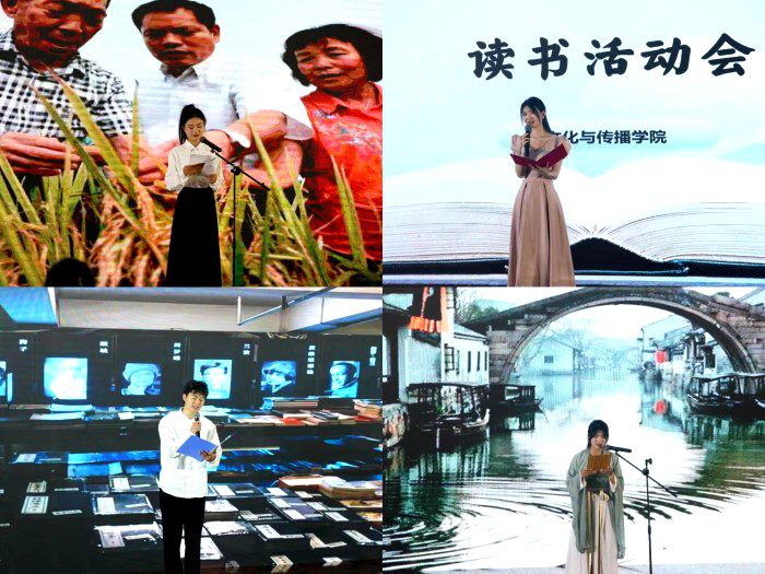 活动在双人朗诵《给太阳》中拉开帷幕,随后由九位同学分别上台诵读经典书籍。22播音班李明阳同学分享了《读书人是幸福人》,以一个读书人的视角呼吁当下年轻人要重唤读书热情,多些书卷气,少些浮躁心;21播音班查靖慈同学所朗诵的《春天,遂想起》则让在场师生共同感受到作者笔下秀丽的江南美景与那日积月累的浓浓乡愁;21播音班周复琦同学倾情演绎的散文《绿的歌》表达了作者对大自然的热爱以及对人生的思考;21播音班孙晓雨同学带来的诗朗诵《春之怀古》通过各种修辞手法的娴熟运用,深刻的表达了作者对环境污染的控诉以及对过去美好春景的怀念。整场活动精彩纷呈、气氛热烈,朗诵选手声情并茂,受到了台下观众的一致好评。最后,读书会在散文朗诵《奶奶的星星》中落下帷幕。