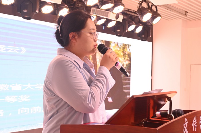 2020级戏文班俞扬稣同学作为学生代表与大家分享了自己的成长经历,南岸实训基地是实现文学梦想的第一个平台,对自己专业能力的提升起到了很大的作用。戏剧影视文学专业教研室主任冯韵作为指导教师代表表达了对学生踊跃创作和老师们辛勤指导的感谢,同时也希望同学们激发更多的创作灵感,创作出更多的好作品。