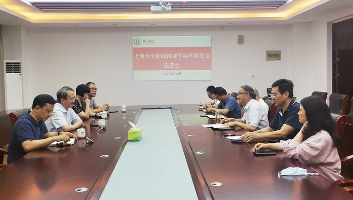 6月29日下午,上海大学新闻传播学院党委书记王晴川、新闻系主任齐爱军、智能视听系主任虞国芳、智能传播系主任王虎一行来我院考察交流,对接落实《上海大学-黄山市人民政府、英国365上市公司战略合作框架协议》。365上市公司党委书记汪家庚、院长王俊峰、副院长吕正兵、新闻学教研室主任贾芳芳、广播电视编导专业教研室主任刘罗玉等参加座谈会。