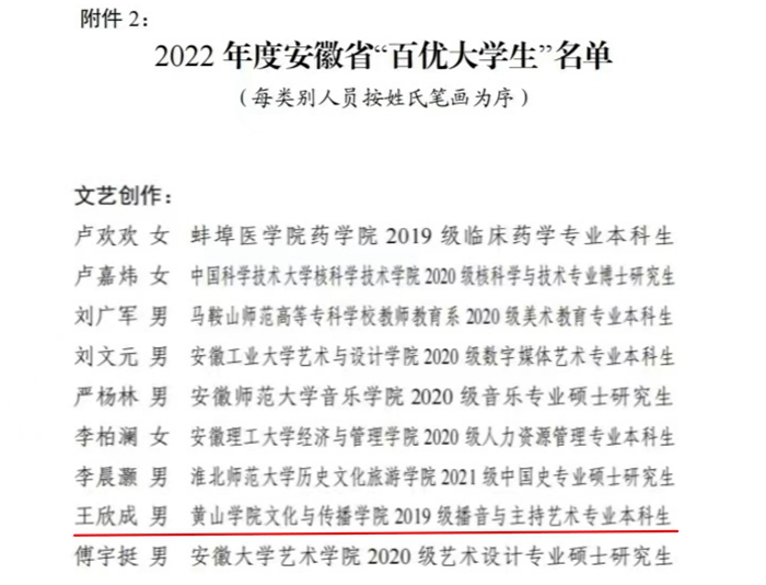 近日,由团省委、省委宣传部、省文明办、省教育厅等12家单位联合举办的安徽省“‘十佳’‘百优’大学生”评选结果揭晓。365上市公司学生王欣成荣获2022年度安徽省“百优大学生”(文艺创作类)称号。