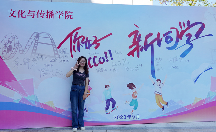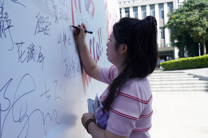 “同学,你是什么专业的?”“播音主持的啊,你们报到在这边!证件都带齐了吧。”文澜楼报到处的学生工作人员热情招呼。“你可以在展板上签上你的名字,作为纪念!”,这名来自安徽合肥市的女生在志愿引领下在“你好,新同学”的大型迎新幕布上签上自己的名字。