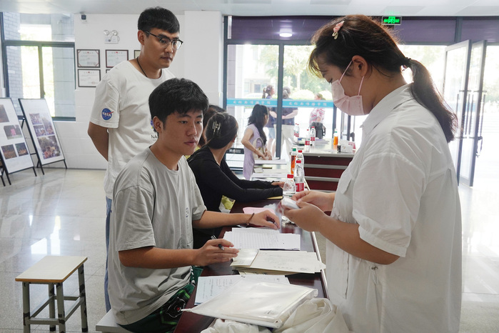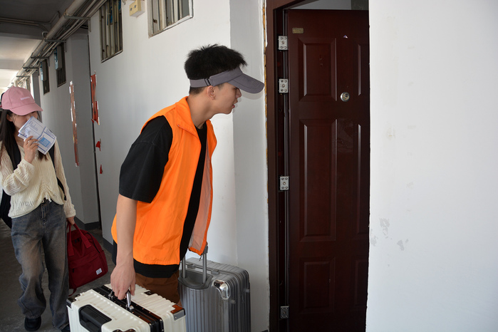 “同学,我想请问一下新闻学新生报到的地方在哪里啊?”一家三口拖着大包小包在21栋宿舍楼下志愿台前停下。“在文澜楼,不过有点远,要走十几分钟呢。要不叔叔阿姨你们留在这里,我们帮你们先把行李搬上去,学弟就让志愿者带到文澜楼,省得你们来回跑了。这天挺热的!”22级播音专业的余首航一边接过家长手里的行李,一边说。“那就谢谢你们了!”橙色马甲们分头行动。余首航提着两个行李箱,一步一步爬上六楼,喘息声在拥挤的楼道里被嘈杂声掩盖。22级戏文专业的郑开心则带着新生去往文澜楼。阳光透过树缝,照射在他的脸上、肩上,化作汗水,滴在地上蒸发。