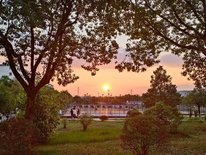 太阳正在西落,天空被染成了金黄色和橙红色,与周围的绿色树木形成鲜明的对比。夕阳的余晖洒在草地上,为这片绿地增添了一抹温暖的色彩。