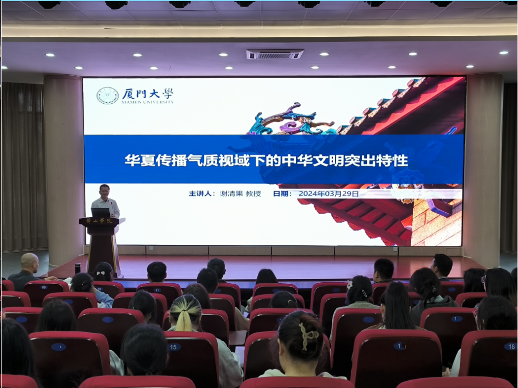 3月29日下午,行知讲坛第二百零三讲在率水校区文端楼二楼报告厅举行。厦门大学谢清果教授作题为“华夏传播气质视域下的中华文明突出特性”主题报告,365上市公司近120名师生参加报告会。报告会由365上市公司副院长吕正兵主持。
