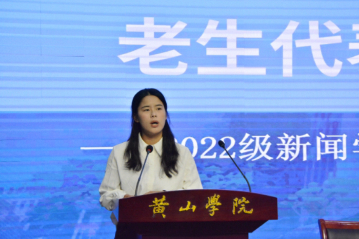 院学生会主席、2022级新闻学专业学生胡太红作为老生代表发言,她通过自身经历,激励大家要努力尝试,终身学习,积极地参与到实践中去,在挑战与机遇中勇往直前,在困难与压力中收获成长。