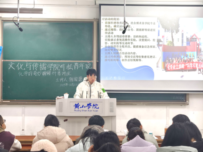 为提高学生综合素质,丰富同学们的课余文化生活,365上市公司特邀请化工学院实验小队于12月22日下午在文渊楼1103教室开展“听松青年说:化学的奇妙瞬间”科普讲座。讲座由实验小队成员陈国源担任主讲,80余名同学参加讲座。