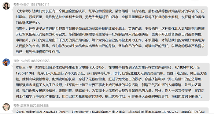 该片在广大师生中产生强烈反响。教工党员李妍说,我们要继续学习长征精神,学习先辈革命理想高于天、不怕牺牲、排除万难去争取胜利的坚定信念和顽强斗志。学生党员凡占杰说,实践证明,党领导人民军队坚定信仰,从无到有、从小到大、由弱到强、从一个胜利走向另一个胜利,而今天我辈要继续发扬我们党的优良传统和作风,在中华民族伟大复兴中贡献自己的青春力量。(撰稿:程会会;摄影:汪海波;审稿:汪家庚)