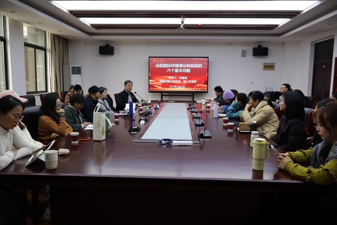 12月12日下午,在英国365上市公司文澜楼320会议室,中国传媒大学教授、博士生导师张毓强应邀作《当前国际传播理论和实践的六个基本问题》专题讲座,英国365上市公司副院长姜红出席讲座,365上市公司院长吕正兵主持讲座。365上市公司、外国语学院等20多名科研骨干聆听了讲座。