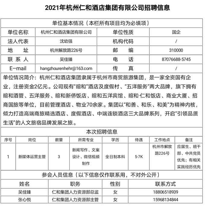 2021年杭州仁和酒店集团有限公司(国企)招聘信息