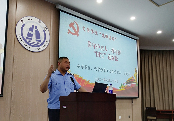 报告会上,胡晓春从个人发展经历、迎客松基本情况、古树名木保护体系讲起,讲述11年默默坚守海拔1670米的山巅,呵护“国宝”迎客松的点滴故事。他围绕“不忘初心、牢记使命、守土有责、尽职担当”的主题思想,用鲜活的事例、朴实的语言、真切的情感介绍自己“十一年只为守护一棵松”的工作职责与使命担当,也表达了因忙于工作无法照顾家庭的愧疚。胡晓春守松至今11年,无论是经历2008年百年不遇的特大冰雪灾害,还是2012年超强台风、2018年低温冰冻雨雪灾害天气等多次极端恶劣天气,他都坚守不惧,勇于面对,凭借精湛的业务水平能力,确保迎客松安全。11年来,他填写《迎客松日记》60本共150万字,详细记载迎客松每天的状态信息,为管理部门和保护专家提供准确的第一手资料。