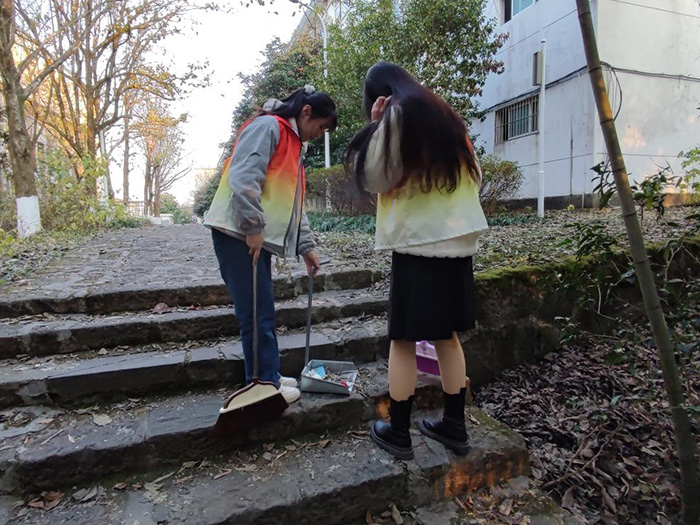 活动当日,同学们分为五组,由党员师生带队,带领入党积极分子清扫文澜楼、校医院等周边区域。同学们身穿志愿者劳动服装,手持拾取器、扫帚和簸箕等劳动工具,仔细清扫路面、楼道的废纸屑、食品袋等各种垃圾。清扫过程中,大家各负其责,相互配合,不放过每一个角落,通过辛勤劳动装扮美丽校园环境。