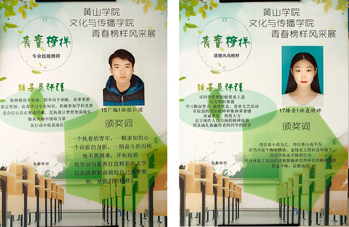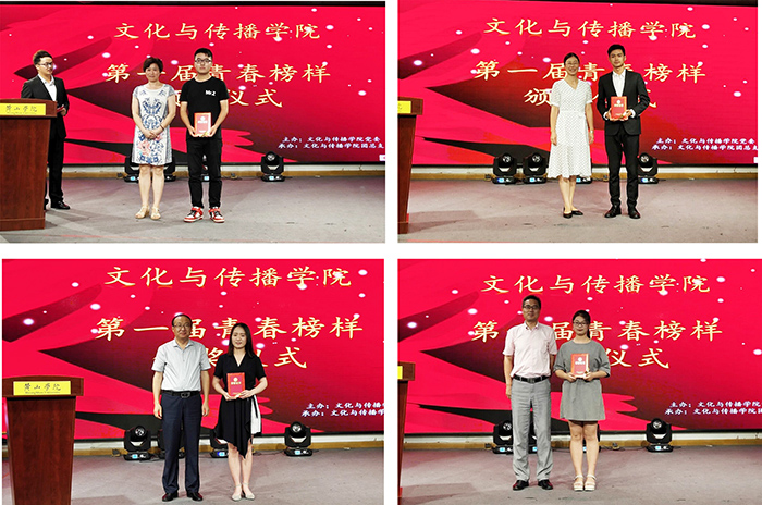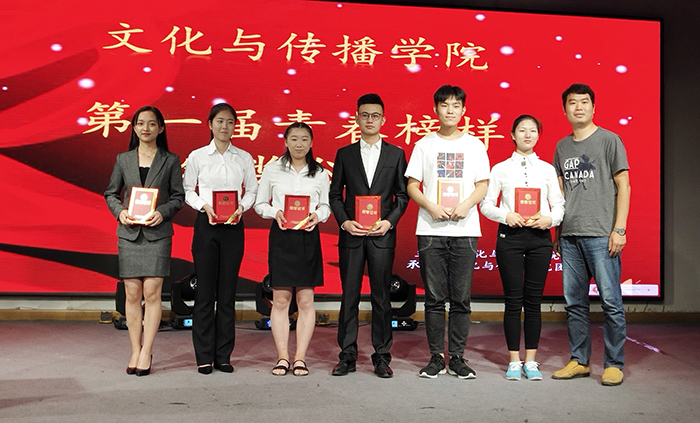 经个人报名、班级推选、学院评审,15广编班张仁国、15播音班韩帅获“专业技能榜样”称号;14广编班窦永梅、16播音班赵阳获“文体活动榜样”称号;15播音班唐梦婷、16戏文班刘明明获“学生工作榜样”称号;16广编2班邵静获“爱心志愿榜样”称号;17播音1班聂婷婷获得“道德风尚榜样”称号。17播音1班吴纯、刘永群,17播音2班陈祥,17新闻班曹惠、余真真、朱馨月等6位同学获得青春榜样提名奖。