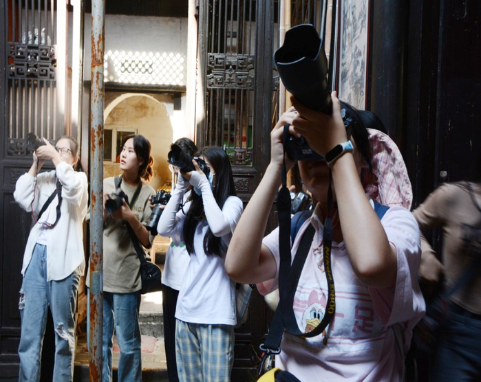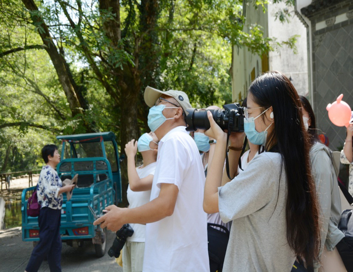在西溪南古镇,老师带领同学们一起细心观察,寻找独到的拍摄对象,指导同学们怎样把学习过的摄影理论知识与实践拍摄相结合。在拍摄过程中,同学们与当地村民热情交流,西溪南老街姚家老宅的一位老人,邀请同学们去他家里参观拍摄,同学们热情高涨,纷纷拿起相机拍摄古宅里的景象。老师不时对同学们拍摄的图片进行指导,及时提出修改调整的意见和拍摄时的注意事项。