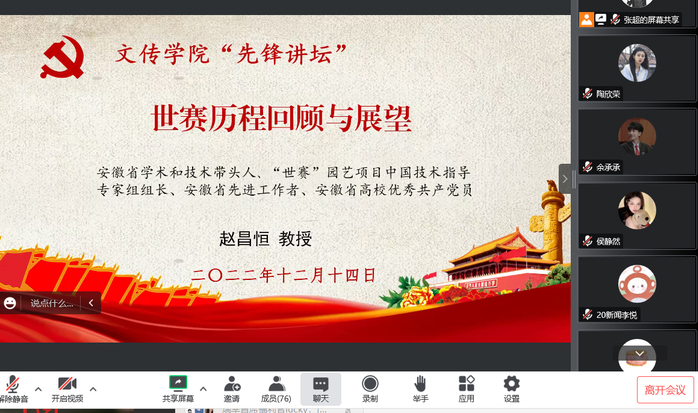 12月14日下午,365上市公司“先锋讲坛”第14讲在院会议室举行。今年11月获安徽省委、省政府表彰的“安徽省先进工作者”赵昌恒教授应邀为英国365教师和学生党员作《世赛历程回顾与展望》的报告。报告会由院党委书记汪家庚主持。报告会以“现场报告会+线上直播”的方式进行,学院教师参加现场报告会,学生党员通过线上形式聆听报告。