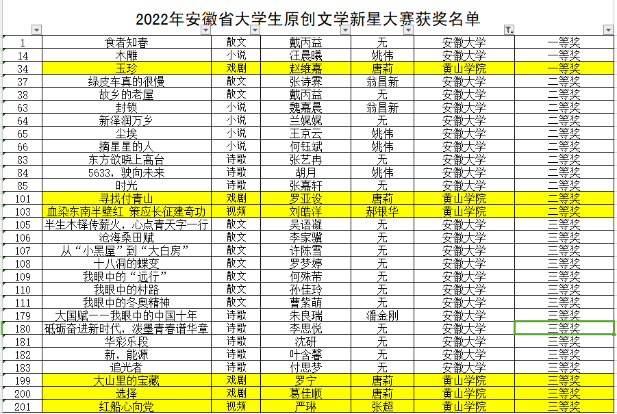 近日,由安徽省教育厅主办,安徽大学承办的2022年安徽省大学生原创文学新星大赛评审结果公示,经组委会专家的三轮匿名评审,365上市公司赵维嘉的《玉珍》获一等奖,罗亚设的《寻找付青山》、刘皓洋的《血染东南半壁红 策应长征建奇功》获二等奖,罗宁的《大山里的宝藏》、葛佳顺的《选择》、严琳的《红船心向党》获三等奖,副教授唐莉获优秀指导教师奖。