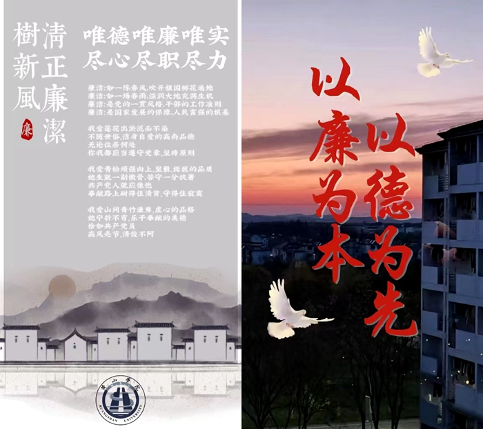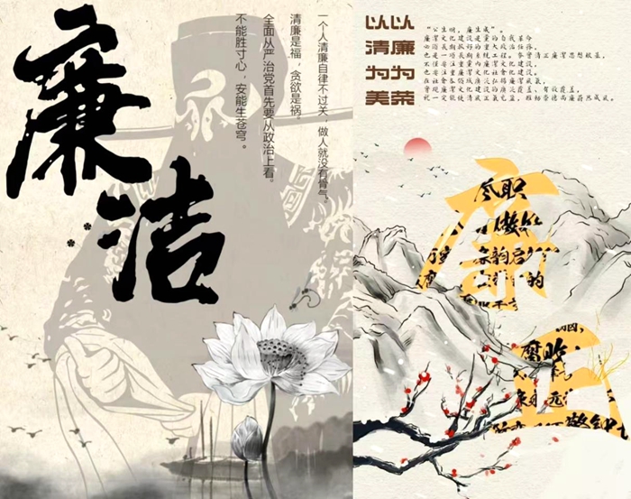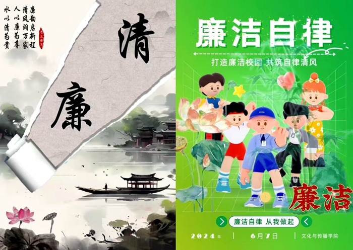 广告设计也是传播廉洁文化的有力手段。其直观、形象的特点深受师生喜爱,学院鼓励学生发挥创意,将廉洁核心理念融入作品。活动共收集近40件广告设计作品,同学们巧妙融合荷花、梅花、竹子等廉洁文化象征物,借助醒目文字、多重元素、鲜明色彩和独特设计,形成强烈的视觉冲击,有效传递了诚信守法、廉洁自律的价值理念。