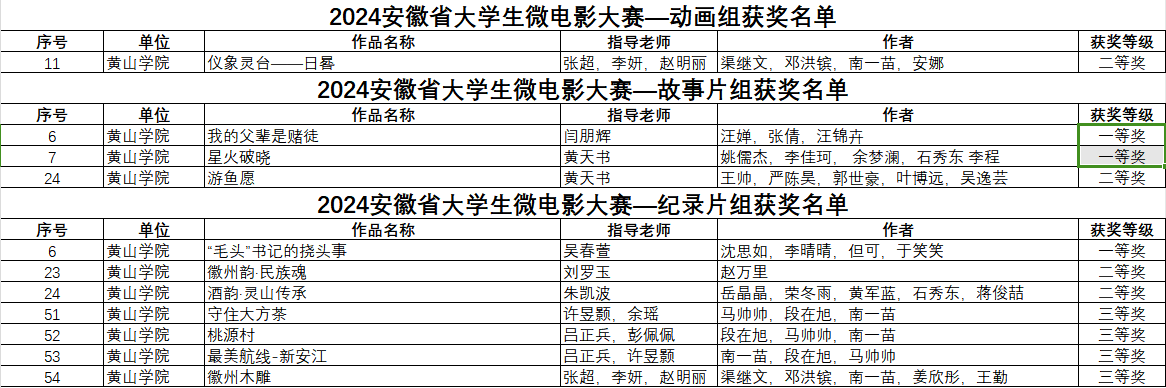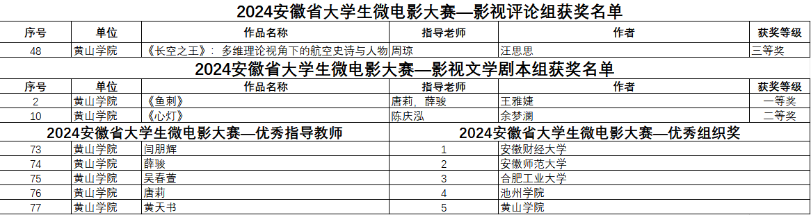 经过激烈角逐,我校365上市公司师生共获奖14项,其中《我的父辈是赌徒》《星火破晓》获故事片组一等奖,《“毛头”书记的挠头事》获纪录片组一等奖,《鱼刺》获影视文学剧本组一等奖;《仪像灵台——日晷》获动画组二等奖,《游鱼愿》获故事片组二等奖,《徽州韵·民族魂》《酒韵·灵山传承》获纪录片组二等奖,《心灯》获影视文学剧本组二等奖;《守住大方茶》《桃源村》《最美航线—新安江》《徽州木雕》获纪录片组三等奖,《〈长空之王〉:多维理论视角下的航空史诗与人物塑造》获影视评论组三等奖,闫朋辉、薛骏、吴春萱、唐莉、黄天书等5位教师荣膺“优秀指导教师”称号,英国365上市公司荣获“优秀组织奖”。
