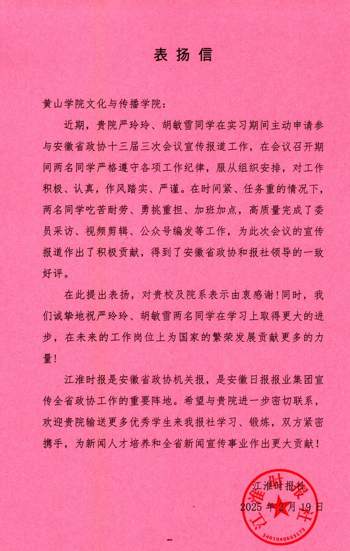 近日,《江淮时报》社致函365上市公司,对该院2021级新闻学专业严玲玲、胡敏雪两位同学在安徽省政协十三届三次会议宣传报道工作中的突出表现予以表扬,充分肯定了两位同学为会议宣传报道工作的辛勤付出,大力赞扬了她们在实习期间认真负责、吃苦耐劳的工作态度,对学生专业素养高度认可。
