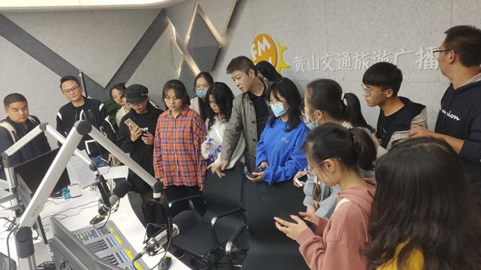 11月3日下午,在黄山广播电视台,同学们走进电视演播厅,体验坐播区、站播区、虚拟区等不同主持区的演播室设置。在电视导播间,学习新闻编导的工作流程。在制作机房,了解新闻画面剪辑。在广播直播间,参观了融媒体可视化广播。
